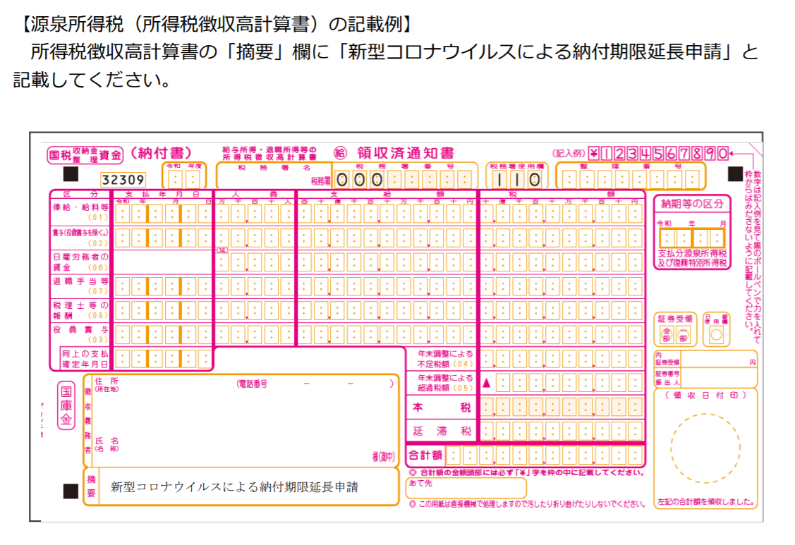 また、源泉所得税においては、納付を行う際に所得税徴収高計算書の「摘要」欄に「新型コロナウイルスによる納付期限延長申請」である旨を付記する。