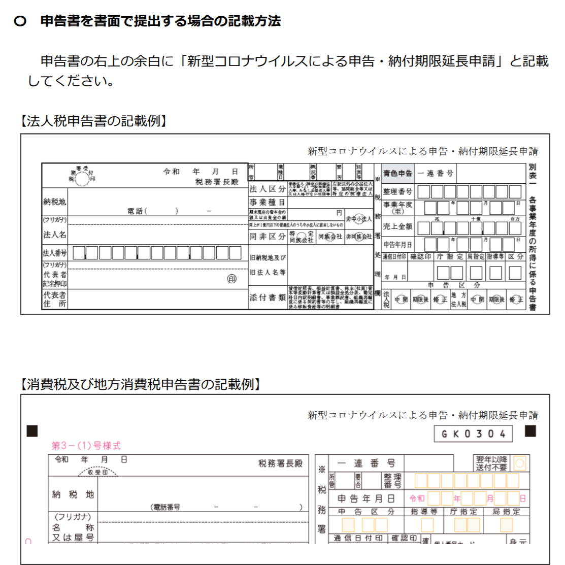 ただし、緊急事態であることや法人の負担を考慮して、別途、申請書等を提出する必要はなく、申告書の余白に「新型コロナウイルスによる申告・納付期限延長申請」である旨を付記することで済む。 具体的には、当初の申告期限以降に申告書を提出する場合には、新型コロナウイルス感染症の影響による申告期限及び納付期限を延長する旨を別紙の方法で作成する。