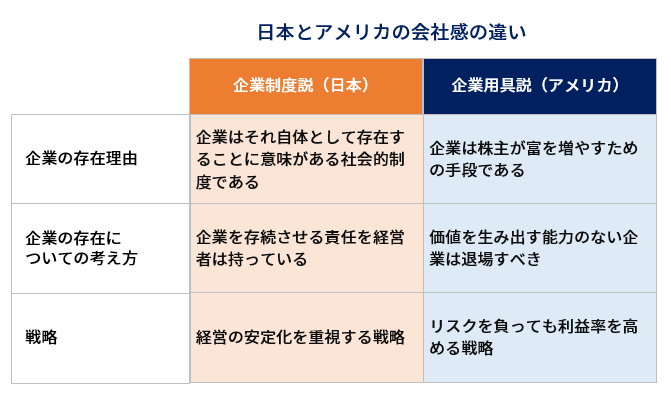 日本では、企業は人々の共同体でありそれを存続させることが経営者の責任である、と考えられていますが、アメリカでは企業は投資家が利益を得るための用具に過ぎず、その価値がなくなれば市場から退場したほうがよいと考えられています。前者は「企業制度説」、後者は「企業用具説」と呼ばれたりします。