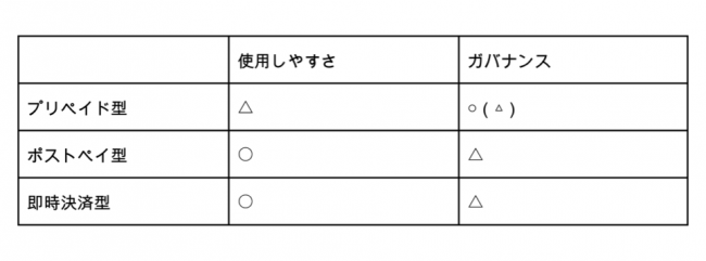 ここまで電子マネーの種類を説明してきましたが、会社として電子マネーを使用、導入する際は、どのタイプを用いるのが好ましいのでしょうか。使用しやすさ、ガバナンスの観点から比較していきましょう。