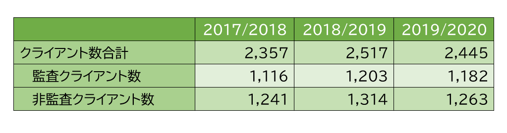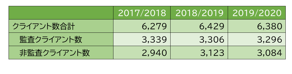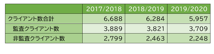 前年度に大きく伸ばしたクライアント数ですが、前々年度の基準までは落ち込んではいないものの、今年度は監査クライアント数、非監査クライアント数ともに減少しています。