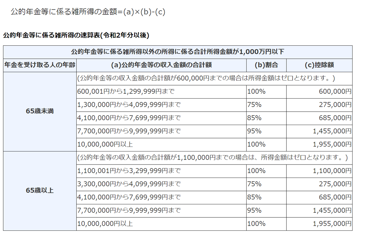 公的年金等の雑所得は次の計算式と表に従って計算します。見ると分かりますが、65歳未満は年間60万円までが、65歳以上は年間100万円までが所得額0円となり所得税がかかりません。