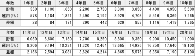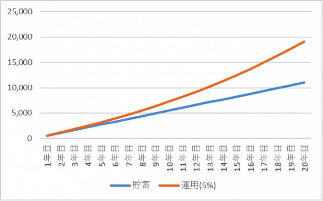 仮にそれぞれ年収1,000万で、世帯の支出はそれほど変わらない(税金、社会保障は倍になりますが)とすると、年間500~600万貯蓄することも十分可能でしょう。このレベルであれば、資産運用せずともFIRE可能かもしれません。全額を預貯金に回したとしても、計算上、10年で5,000~6,000万円、20年で1億~1億2千万円程度、貯められることになります。参考までに、毎年550万円積み立てるケースで、運用の有無による資産残高の差を見てみます(利回りは同じく5%)。