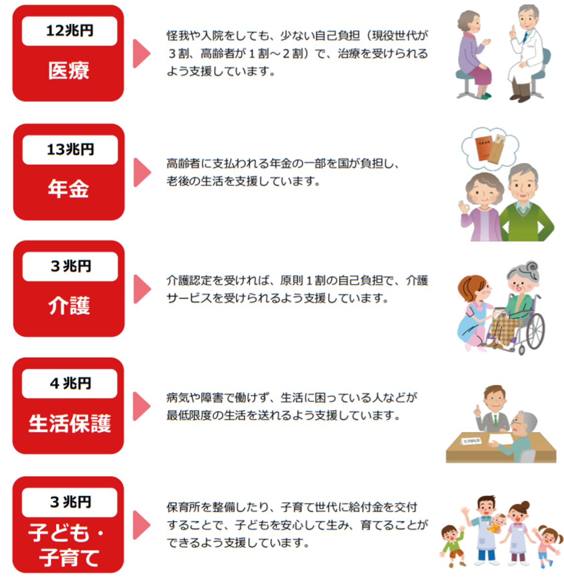 内訳から、医療と年金にもっとも予算が充てられているのが分かります。少子高齢化が進んだからです。