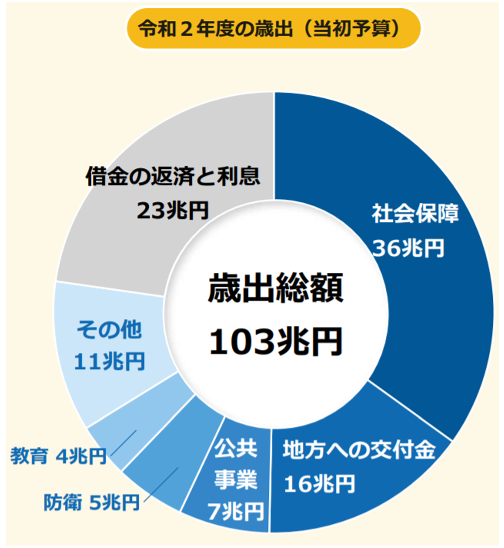 ずらずらっと並べてみましたが、気になるのは「どれに一番多くお金を割いているか」です。新型コロナウイルス感染症が深刻な問題となる前は、毎年同じような割合で歳出が決められていました。2020年度(令和2年度)の当初予算で配分割合を見てみましょう。