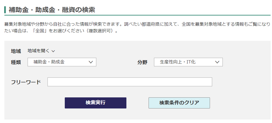 J-Net21は、独立行政法人中小企業基盤整備機構が運営している中小企業を支援するポータルサイトです。このサイトでは、全国の補助金や助成金の情報を検索することができます。募集地域や分野(起業・創業、生産性向上・IT化、研究・商品開発など)を指定して、該当する補助金や助成金を検索します。フリーワードでの検索も可能です。