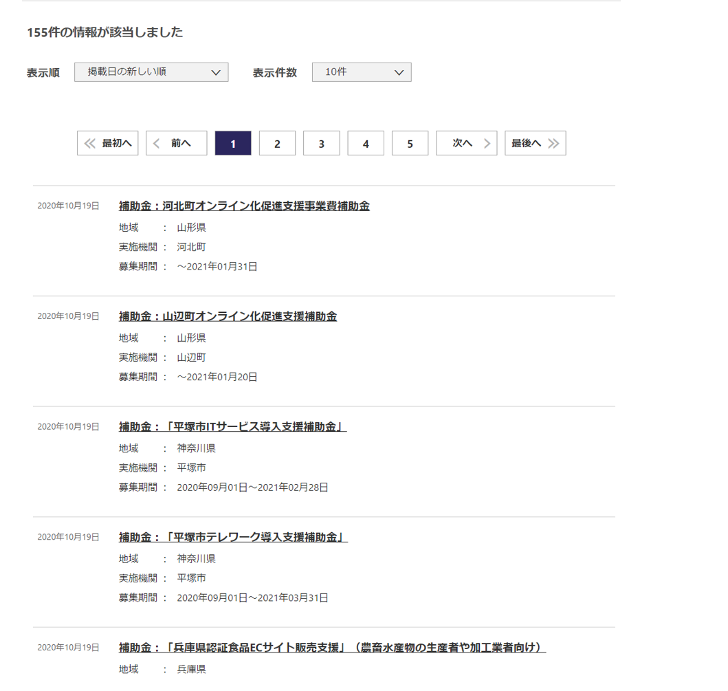 経済産業省や農林水産省など各省庁が行っている補助金、ジェトロなど独立行政法人が行っている事業、各自治体で行っている補助金や支援金などが対象となっています。各自治体で行っているものなど網羅されているとは限らないようですが、おおよそ調べることができます。