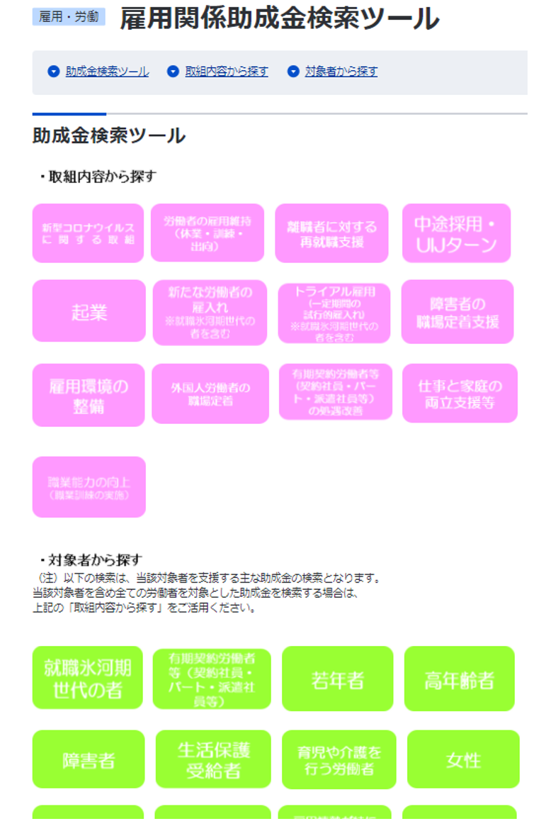 厚生労働省が行っている雇用や人材育成などに関する助成金を検索することができます。「新たな労働者の雇入れ」や「離職者に対する再就職支援」といった取組内容から探せます。また、「就職氷河期世代」や「高齢者」など対象者から該当する助成金を調べることも可能です。