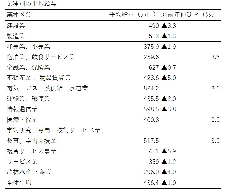 業種別にみると、前年分と比べて平均給与が増えている業種は、「宿泊業、飲食サービス業」、「電気・ガス・熱供給・水道業」、「医療・福祉」、「学術研究、専門・技術サービス業、教育、学習支援業」の4業種となっている。最高は「電気・ガス・熱供給・水道業」の824万円、最低は「宿泊業、飲食サービス業」の260万円で業種自体に変化はない。