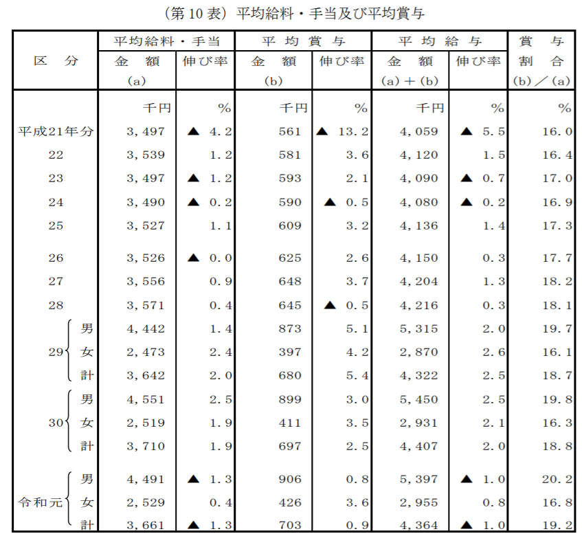 平均給与の内訳は、平均給料・手当が366万1千円(男性449万1千円、女性252万9千円)、平均賞与が70万3千円(男性90万6千円、女性42万6千円)で、業績で影響するはずの賞与は微増している反面、給料が減少しているのが特徴だ。この結果、給料・手当に対する賞与の割合は19.2%となり、平成25年分以降6年連続で賞与割合が増えていて給与に占める割合も2割に近づいている。