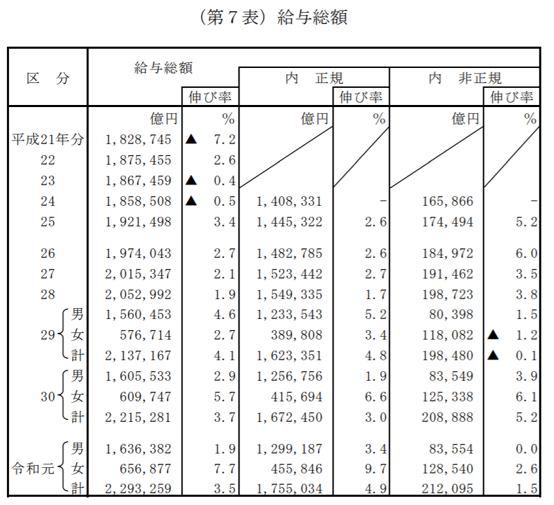 給与所得者の給与総額は229兆3259億円と前年分に比べ7兆7978万円増加したものの、給与所得者数の増加の方が上回った結果、1人当たりの年間平均給与は436万4千円(同4万3千円減)となり、実に7年振りに減少に転じた。平均給与を男女別でみてみると、男性は539万7千円(正規561万4千円、非正規225万6千円)と5万3千円前年分より減少し、女性は295万5千円(正規388万9千円、非正規152万2千円)と2万4千円前年分より増加しており明暗が別れた。また、男女ともパートタイマーやアルバイト、派遣・契約社員といった非正規者の平均給与が、2.5%減少と平成25年以来の前年割れとなっていて、性別でみると女性の1.2%の減少に対して男性は4.4%も大きく減っている。
