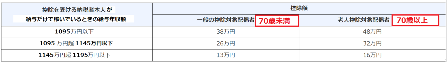 配偶者控除の額は「納税者本人の所得」×「配偶者の年齢」で決まります。妻・夫が現役世代なら納税者本人の収入だけを意識しましょう。配偶者の稼ぎは控除額に一切影響しないので注意してください。