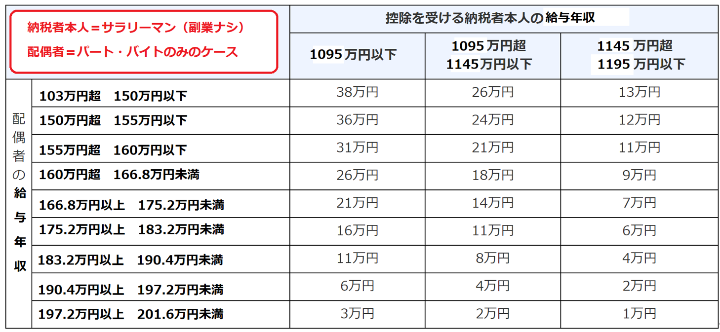 ちなみに、納税者本人も配偶者も給与だけが収入ならば、控除額は次のようになります。