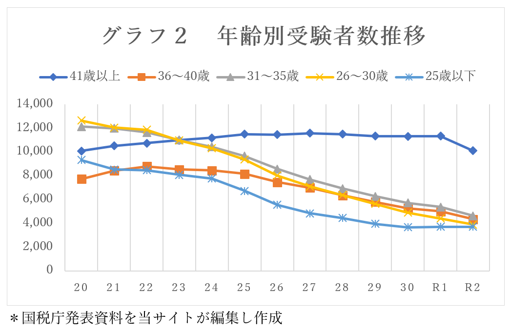 グラフ2は平成20年度以降の受験者数の推移を年齢別に見たものだが、若者層ほど税理士試験離れが進んでいることが分かる。25歳以下は、平成20年度は9320人が受験したが、今回の令和2年度は3716人まで減少。26歳~30歳の層に至っては、20年度は1万2645人受験していたが、今回は3分の1以下の3890人だった。31歳から35歳の層も、20年度は1万2117人受験していたが、今回は4619人まで減少している。一方で、41歳以上の受験者数はほぼ横ばいで、1万人台を上下している。
