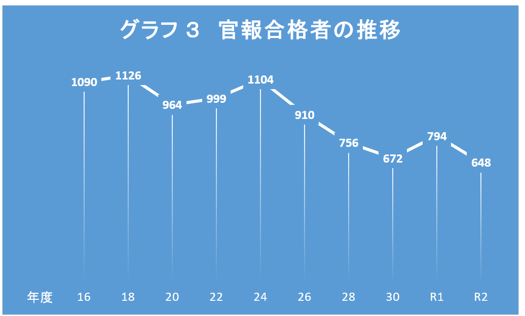 今回、5科目合格の官報合格者は648人で、昨年度の749人から101名減った。とはいうものの、その前の平成30年度は672人だったことから、今回試験で合格者が激減していたわけではない。ただ、官報合格者は、受験者数の減少と比例して減少を続けており、平成16年度の1090人からすると、今回は半分近くまで減ったことになる。