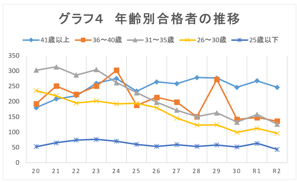 平成20年度には、「31歳~35歳」が303人でもっとも多く、ついで「26歳~30歳」の236人で、官報合格者全体の59%と約6割を占めていたことからすると、大きな違いとなっている。ちなみに、このとき41歳以上が全体に占める割合は約19%で2割を切っており、40歳以下が合格者の約8割を占めていた。
