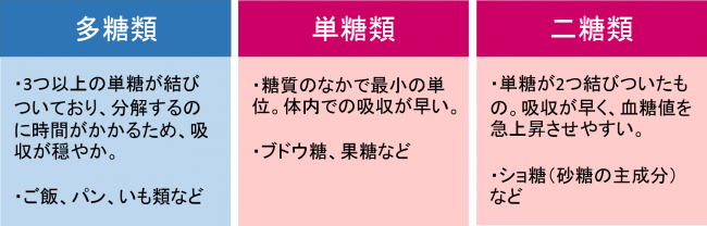 ポイントは「吸収の速さ」。糖質の種類によって吸収の速さが異なります。おすすめは「多糖類」。ご飯やパン、いも類などは分解に時間がかかるため、吸収が穏やかで、血糖値が急上昇しにくい食材と言えます。一方、砂糖の主成分であるショ糖や果物に含まれる