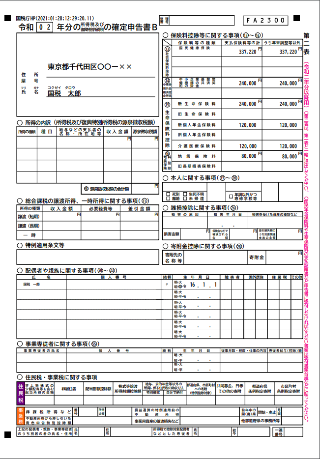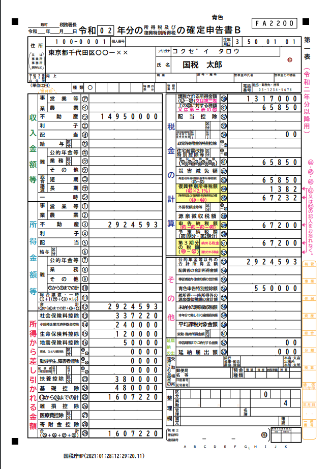 詳しくは、国税庁ホームページ:「令和2年分所得税及び復興特別所得税の確定申告の手引き確定申告書B用」(https://www.nta.go.jp/taxes/shiraberu/shinkoku/tebiki/2020/pdf/002.pdf)を参照してください。