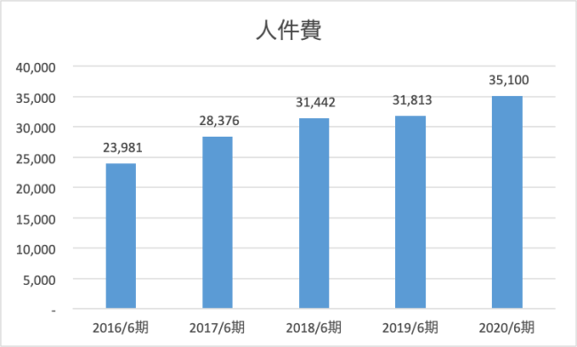 業務費用と同様の推移になっていますが、人件費の増加率は46%と費用全体の増加幅に比べて抑えられており、また増収幅と同程度であることから比較的コントロールされているように見えます。