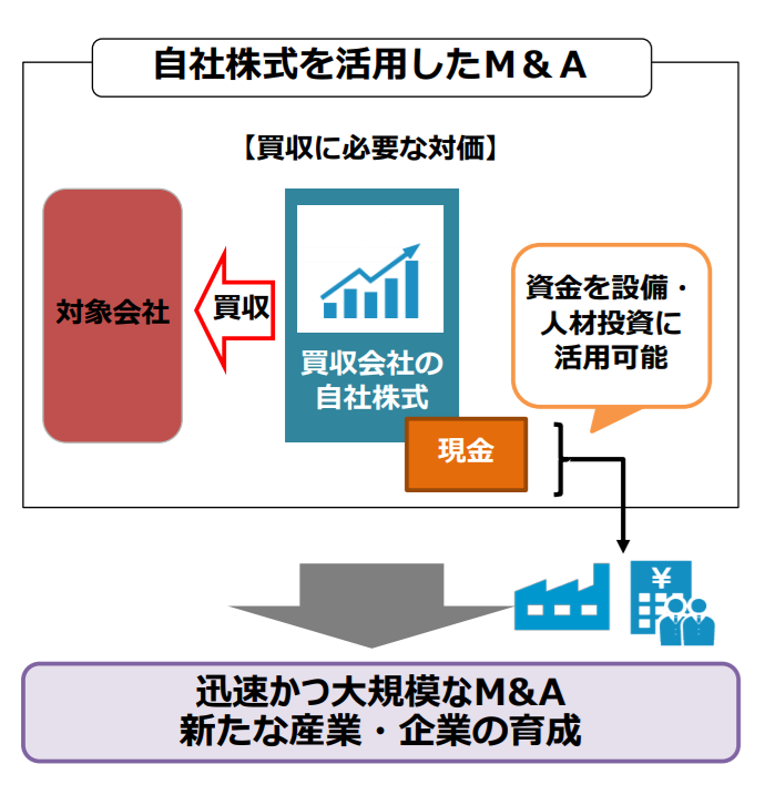 自社株式等を対価とすれば、余計なコストをかけずに事業再編を進められます。買収コストは自社株にすれば、現金を設備や人材への投資に使い、資源を有効活用できるわけです。また、手元資金や借入可能額を上回る大規模なM&Aも可能になります。