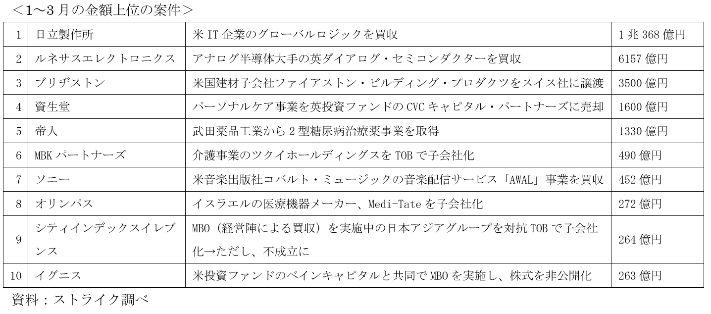 取引金額1千億円超の大型M&Aは5件中、日立、ルネサスエレクトロニクス、ブリヂストン、資生堂はいずれも海外案件。国内企業間では帝人が武田薬品工業から2型糖尿病治療薬事業を買収する案件が最も大きく、その額は1330億円となっている。