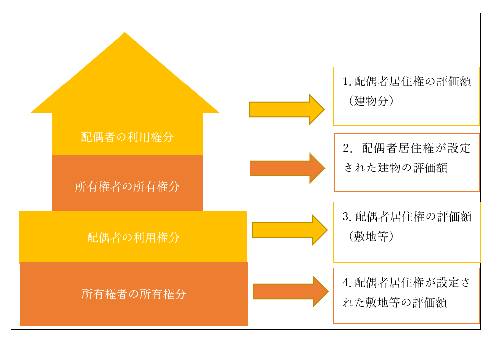 なぜ節税になるのかを見る前に、どう評価するのかを確認しましょう。配偶者居住権の設定された自宅は、4つに分けて評価します。