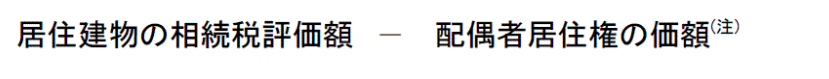 「配偶者居住権の価額」は1で評価した金額です。つまり、「居住権を設定せずに丸ごと相続したときの自宅建物の評価額」から「配偶者居住権の建物部分」を引いた金額が、所有権者分の評価額になります。