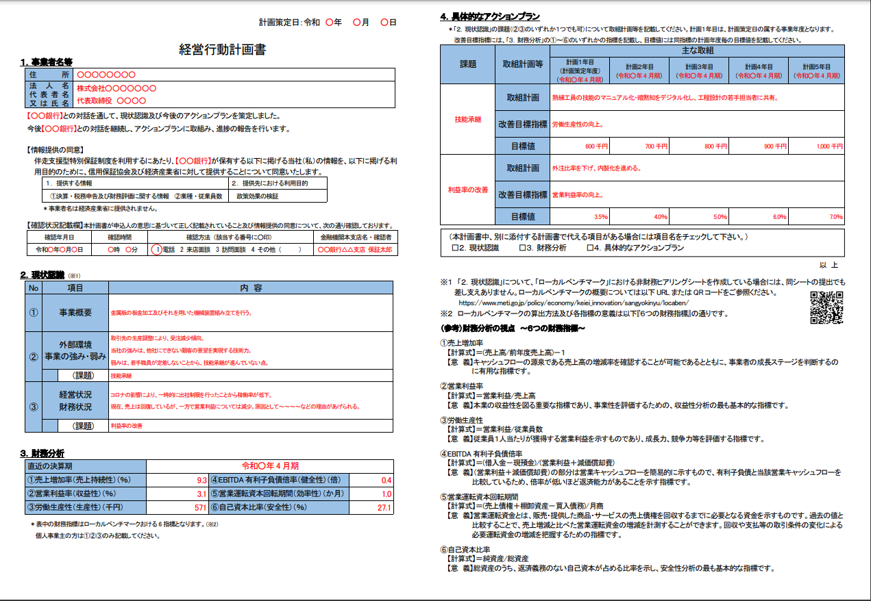 ・申込人の経営に係る現況・課題(原則として、計画を策定した日の属する事業年度の全事業年度の財務状況の分析を含む。)と課題を克服するための取り組み事項。