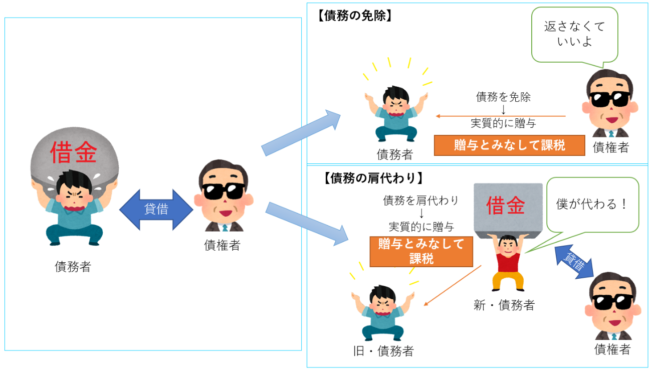 借金や未払費用の支払いを免除してもらったり、あるいは誰かに肩代わりをしてもらったりしたときも、贈与税がかかります。「本来、自分が弁済しなくてはならないのに、その支払義務がなくなった」ということは、その分だけ得しているからです。この得した部分が贈与とみなされます。