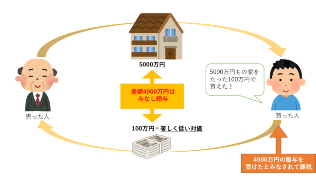 個人から著しく低い対価で財産を売ってもらったときも、贈与税の対象となります。「格安で売ってもらった」ということは、普通に買うときよりもずっと得しているからです。