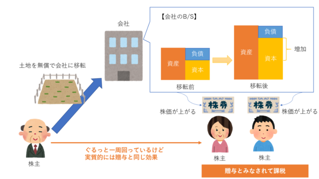 株主個人から無償で財産をもらったり格安で購入したりすると、会社はそれだけ得します。そして、会社の純資産の価値が得した分だけ上がります。結果、会社の価値を表す株式の価額も上がります。ぐるっと一周しますが、「オーナー社長が他の株主に株価上昇分だけ贈与した」とみなされ、他の株主に贈与税がかかるのです。