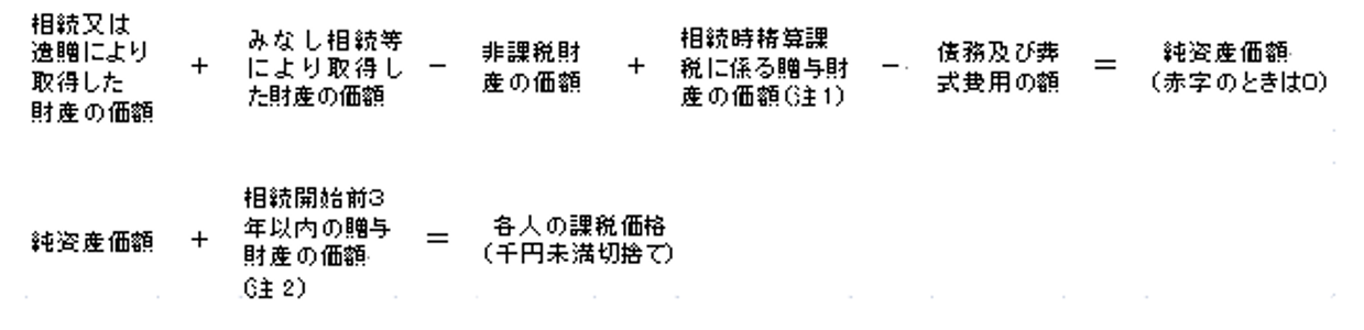 まず、故人から相続や遺贈で財産を取得した人それぞれにおいて「正味の遺産額」を計算します。ここでいう正味の遺産額とは、次の流れで計算した金額です。