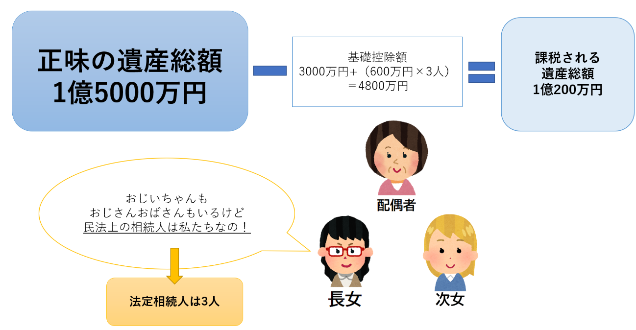 例えば、遺された親族が被相続人の配偶者と長女と次女、父親と兄妹だとしましょう。この場合、法定相続人は配偶者と2人の子どもとなり、基礎控除額は「3千万円+(600万円×3人)=4800万円」となるのです。