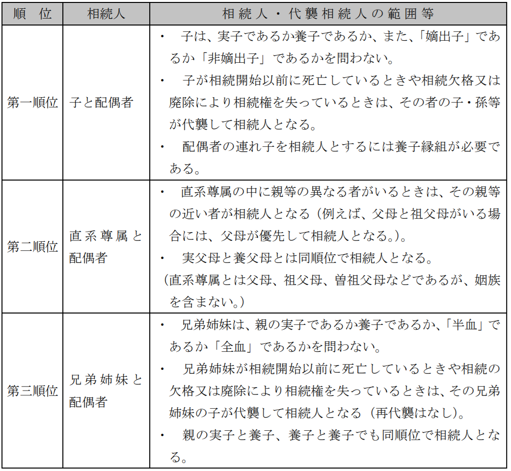 この法定相続人というのは、民法で定められた相続人のことです。配偶者は常に法定相続人になりますが、血族については「子→直系尊属(両親や祖父母)→兄弟姉妹」と、被相続人に近しい順に決まります。