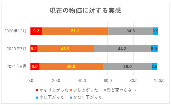 「現在の物価を1年前と比べるとどのように感じているか」日本銀行情報サービス局が2021年7月に発表した調査結果です。