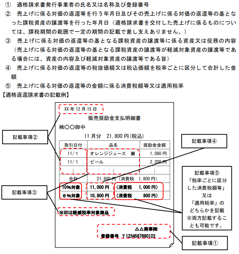 値引きや返品の都度、「適格返還請求書」を作成しなくてはなりません。記載項目も決まっています。次の5つです。