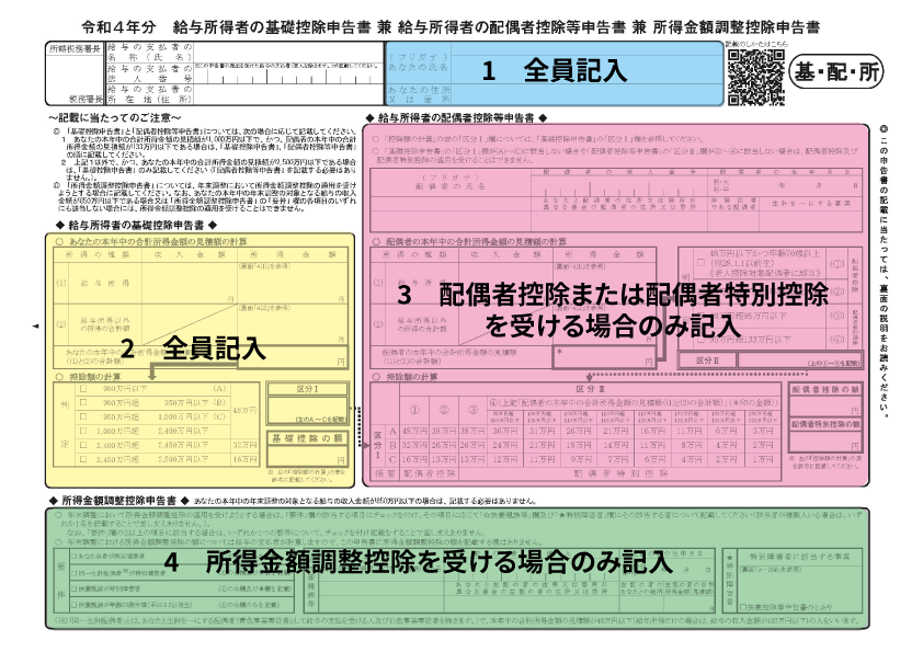 年末調整を受ける人全員が提出:令和4年分 給与所得者の基礎控除申告書 兼 給与所得者の配偶者控除等の申告書 兼 所得金額調整控除申告書(キハイショ)