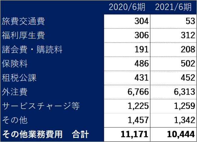 人件費以外では、その他業務費用△7億円(△6.5%)、採用及び研修費用△2億円(△28.1%)、IT機器費用等及び通信費+2億円(+10.3%)となっています。減少している採用関連費用やその他に含まれる旅費交通費、また増加しているIT機器費用等及び通信費についてはコロナの影響があったかもしれません。またその他業務費用の半分以上を占める外注費が△4億円(△6.7%)と減少しているのが目立ちます。