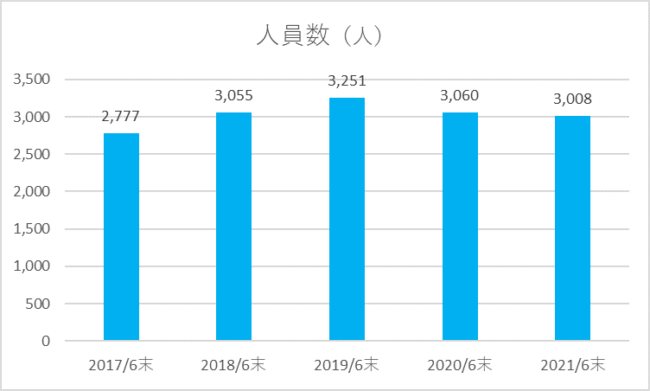 2021年度の人員数は3,008人となり、前期比△52人(△1.7%)となっています。
