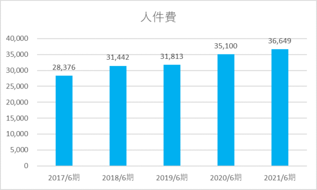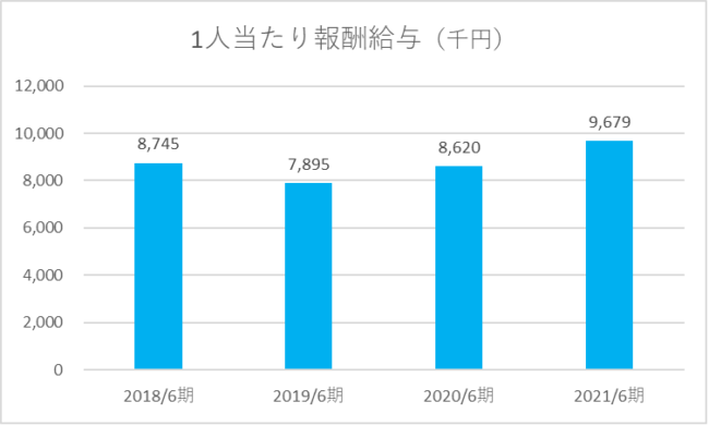 2018~2020年度は700~800万円台で推移していましたが、2021年度は967万円と1千万円に迫る水準となっており、前年と比べても10%以上の伸びとなっています。上述の人員構成の変化の他、業務量の増加に伴う残業代などが背景として考えられます。