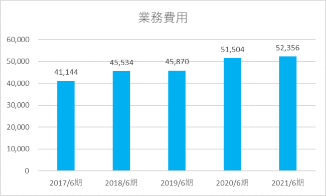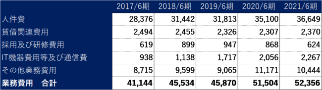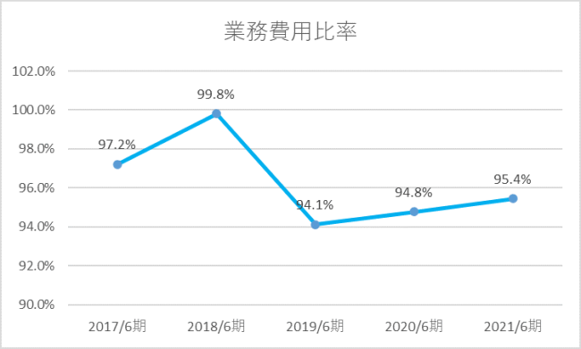 2020年度は+56億円(+12.3%)と大きく増加していましたが、2021年度は増加しているとはいえ、抑制された水準となっています。2017年度以降でみると、増収に伴い業務費用も増加したことでCAGRは+6.2%となっているものの、売上のCAGR+6.7%は下回っています。また2021年度の売上に占める業務費用の割合(業務費用比率)は95.4%となり、2018年度の99.8%をピークに直近3期は94~95%程度となっています。