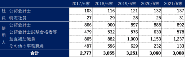 内訳を見ると、その他の事務職員△99人、公認会計士試験合格者等△52人に対して監査補助職員+84人、社員+11人、公認会計士+4人となっています。人員数こそ減少しているものの、比較的高コストな社員と公認会計士が増加しています。