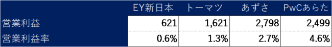 営業利益率は低下傾向にあるとはいえ、4.6%という数字は他法人に比べるとかなり高くなっています。売上こそ他法人の半分程度ですが、利益ベースで見るとPwCあらたは有限責任 あずさ監査法人(以下あずさ)に次ぐ2位となっています。