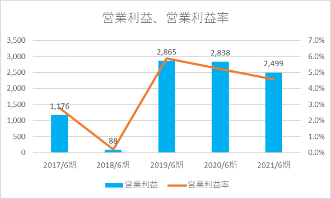 2021年度の営業利益は24億円で前期比△3億円(△11.9%)、営業利益率は4.6%で前期比△0.7%となっています。