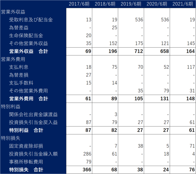 営業外収益費用、特別損益項目について年度ごとの推移を見てみます。