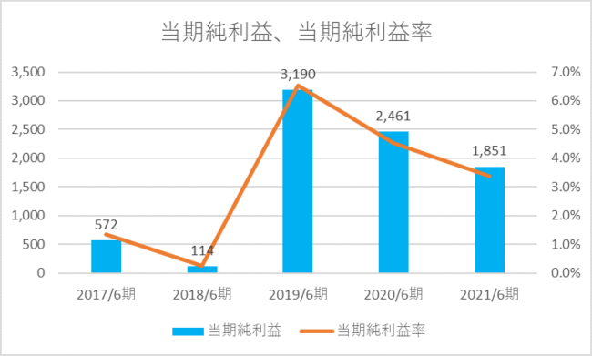 2021年度の当期純利益は18億円で前期比△6億円(△24.8%)、当期純利益率は3.4%で前期比△1.2%となっています。