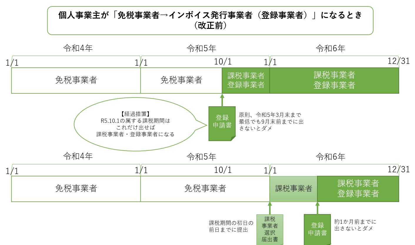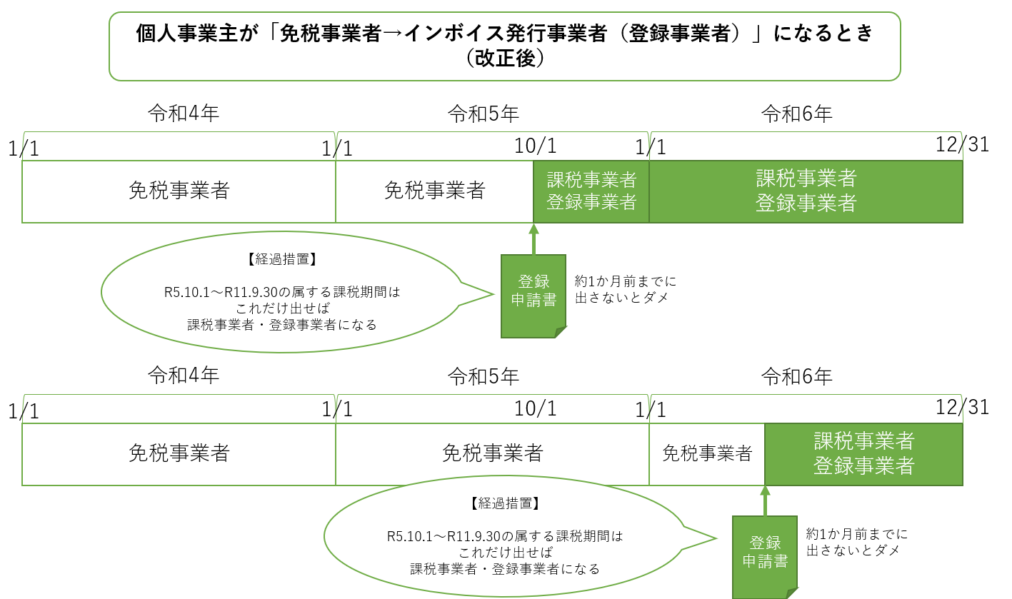 ただし、インボイス導入時期に限っては、経過措置により課税事業者と登録事業者に同時になることはできます。登録申請書1枚だけを出せばいいのです。原則、令和5年3月末までに提出すれば、課税期間の途中でも、同年10月1日から「課税事業者+発行事業者(登録事業者)」になれます。けれど、令和5年10月1日の属する課税期間だけです。