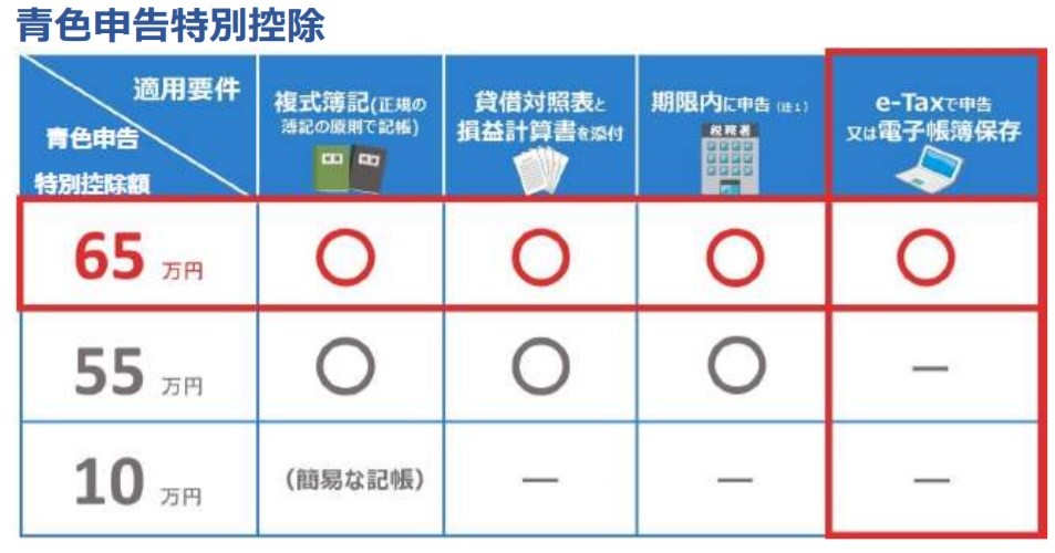 青色申告を行うと、事業所得の額からさらに「青色申告特別控除額」を差し引けます。65万円・55万円・10万円のいずれかです。それぞれ条件は次のようになっています。