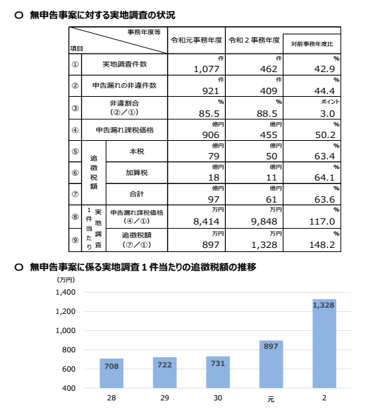 一方、申告納税制度の下で⾃発的に適正な申告・納税を⾏っている納税者の税に対する公平感を著しく損なうものであることや、前記のように相続税の基礎控除の見直しに伴い申告・納税義務があるのに申告しない者が後を絶たないことから、国税当局では資料情報の収集・活⽤など無申告事案把握のための取組を積極的に行い、厳しく目を光らせている。令和2事務年度は462件(前事務年度比57.1%減)の無申告事案に対して調査を行っており、409件(同55.6%減)から455億円(同49.8%減)の申告漏れ課税価格を把握し、61億円(同36.4%減)を追徴している。1件当たりの申告漏れ課税価格は9848万円(同17%増)、追徴税額は1328万円(同48.2%増)で、追徴税額は集計を始めた平成21事務年度以降最高となっていて、無申告についてもかなりの成果を上げている。