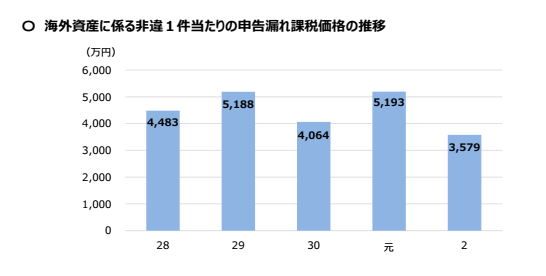 国税庁が相続税調査において無申告とともに力を入れているのが、納税者の資産運用の国際化に対応し相続税の適正な課税を実現するための「海外資産関連事案に対する実地調査」。調査では、財産債務調書・国外財産調書・国外送金等調書といった各種法定調書や部内資料のほか、職員の海外出張や租税条約等に基づく情報交換制度、CRS情報(共通報告基準に基づく非居住者金融⼝座情報)などを効果的に活用し、海外取引や海外資産の保有状況の把握に努めている。2事務年度においては、相続又は遺贈により取得した財産のうちに海外資産が存するもの、②相続⼈、受遺者又は被相続人が⽇本国外の居住者であるもの、③海外資産等に関する資料情報があるもの、④外資系の金融機関との取引があるもの等のいずれかに該当する海外資産関連事案551件(同45.3%減)の実地調査を行い、そのうちの2割弱にあたる96件(対前事務年度比35.6%減)から34億円(同55.6%減)の申告漏れ課税価格を把握している。またこのうちの9億円(同20.4%減)が不正等による重加算時の賦課課税対象となっている。この結果、非違1件あたりの申告漏れ課税価格は5193万円から3579万円に減ってはいるが、相続税の実地調査1件あたりの申告漏れと比べて高額だ。